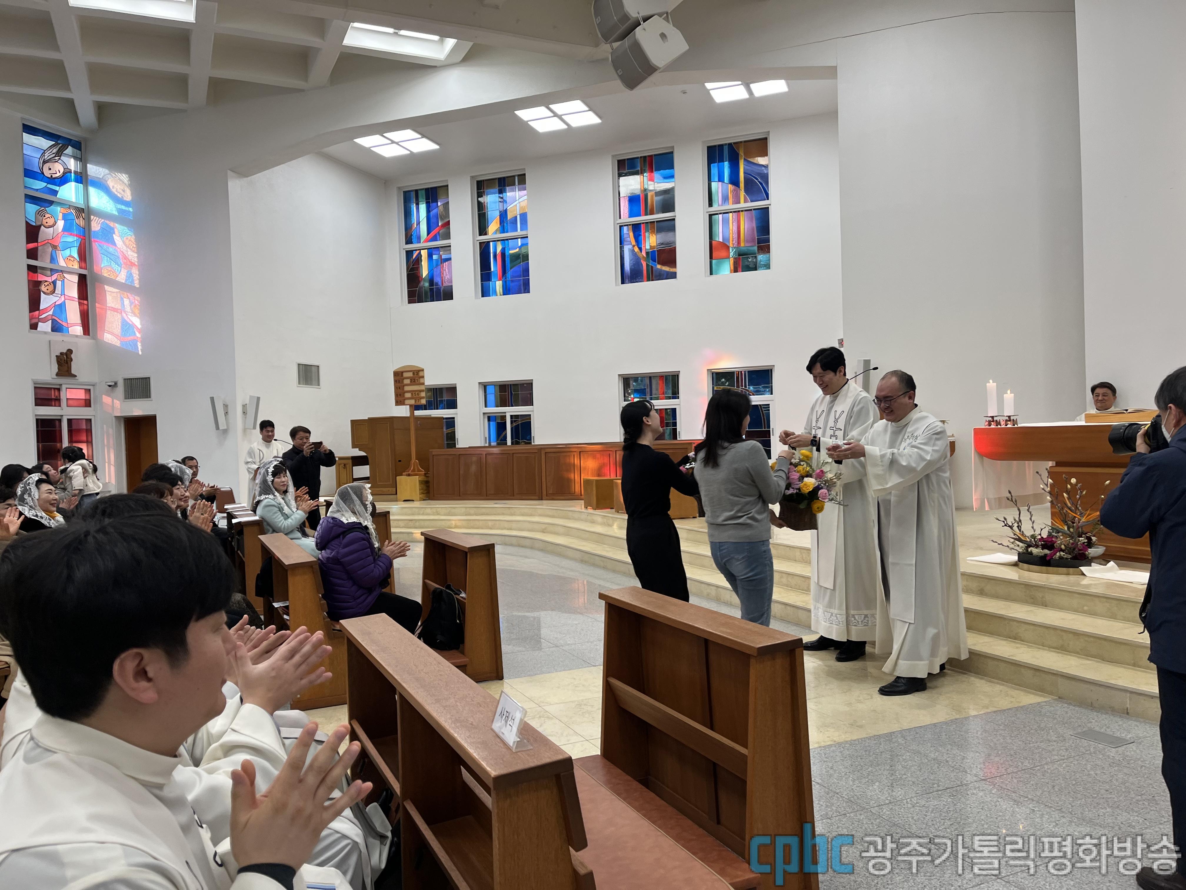 용봉동본당 보좌 이맑음(마오로) 신부: 안녕하십니까? 이맑음 마오로 신부입니다. 김용빈 신부님이랑 김상훈 신부님이 이제 해외로 선교 나가신다고 해서 인사드리고 싶어서 이렇게 방문하게 되었습니다. 신부님들! 선교지에서도 늘 건강하시고 행복하시고 건강하게 다시 뵐 수 있었으면 좋겠습니다. 사랑합니다.