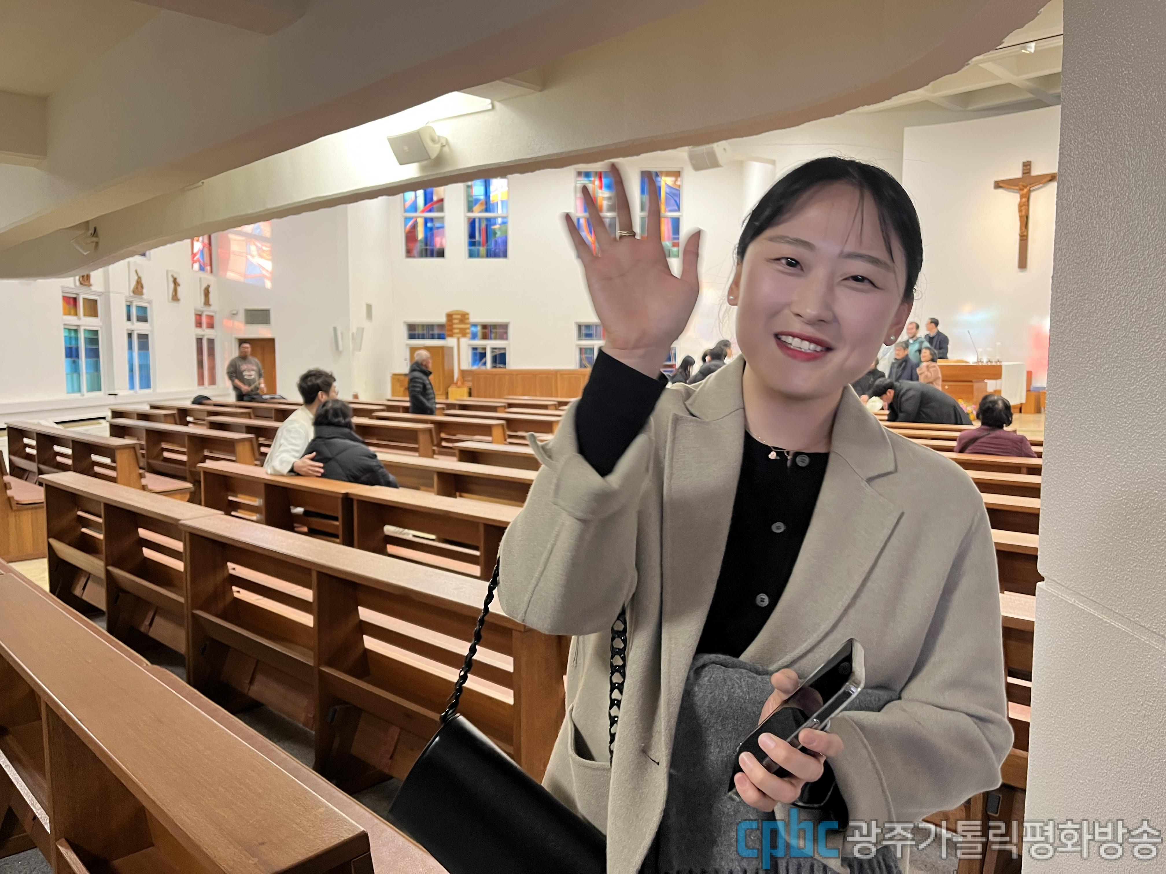 진행자: 저는 해외 선교사들 파견 미사가 봉헌될 광주대교구청에 나와 있습니다. 먼저 이 자리에 함께하고 있는 신자분들 만나볼게요. 안녕하세요?