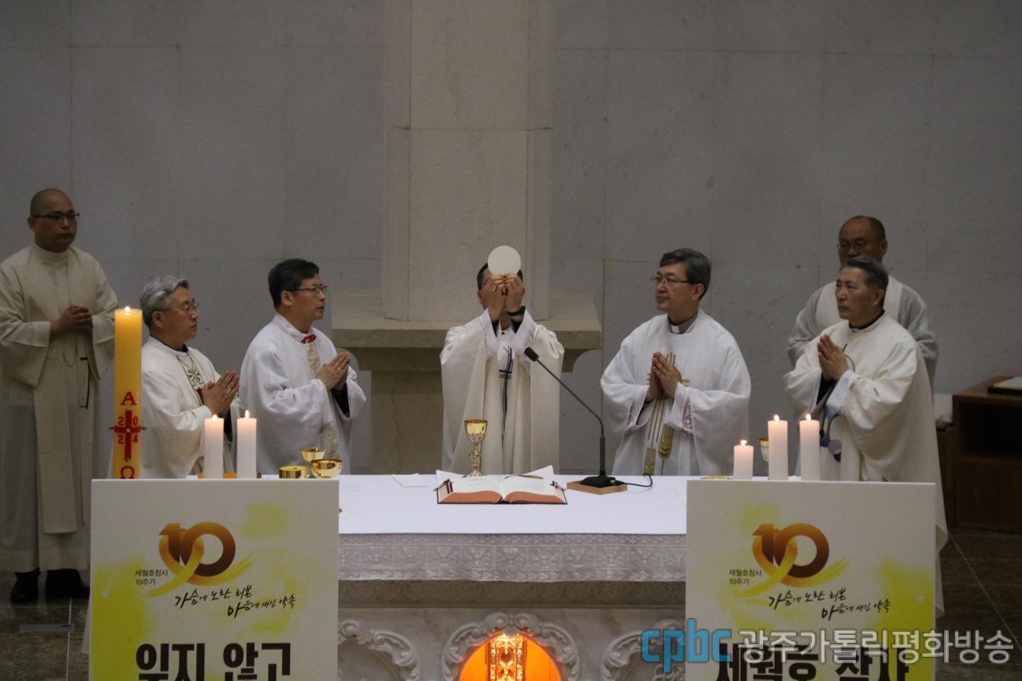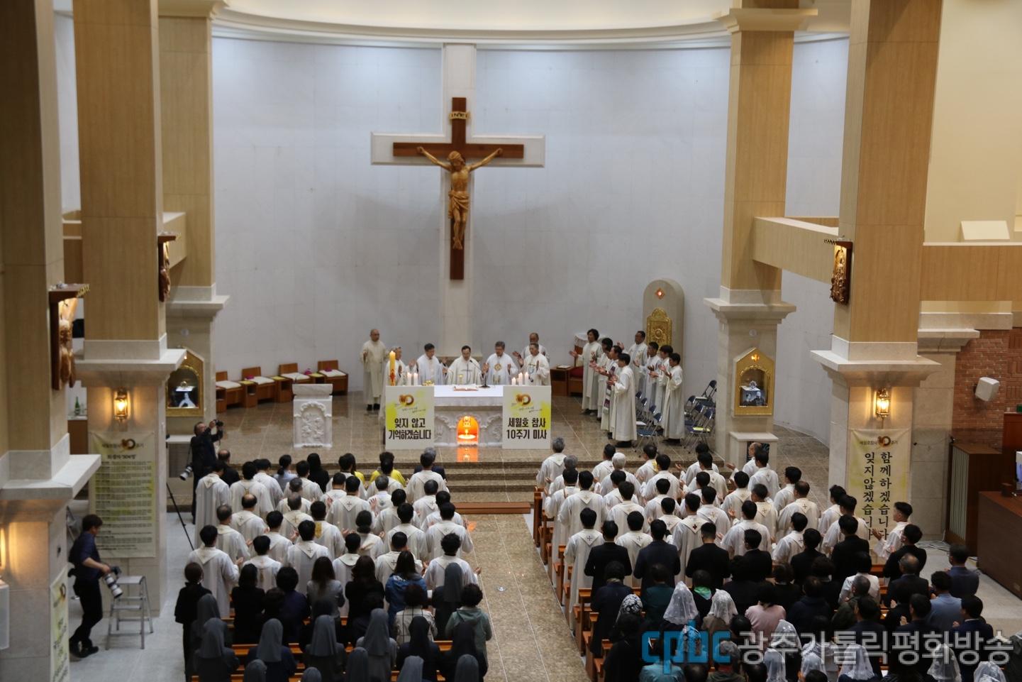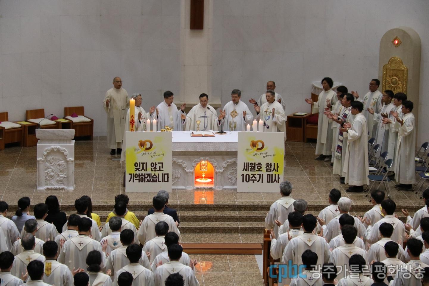 오늘(15일)오후 2시 목포 산정동준대성전에서 주교회의 정의평화위원회 위원장인 김선태 주교(전주교구장)가 주례한 가운데 봉헌한 세월호 참사 10주기 추모미사는 광주대교구장인 옥현진 대주교와 정순택 서울대교구장, 문창우 사회주교위원장(제주교구장), 박현동 아빠스를 비롯해 광주와 마산, 수원 등 10개 교구 정의평화위원회 소속 사제와 수도자, 세월호 유족, 신자 등 1천500여명이 참례한 가운데 거행됐습니다.