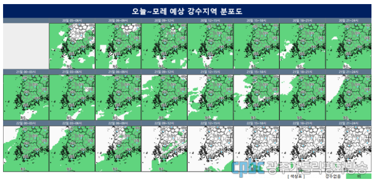 광주·전남지역 예상 강수지역 분포도 <자료제공=광주기상청>