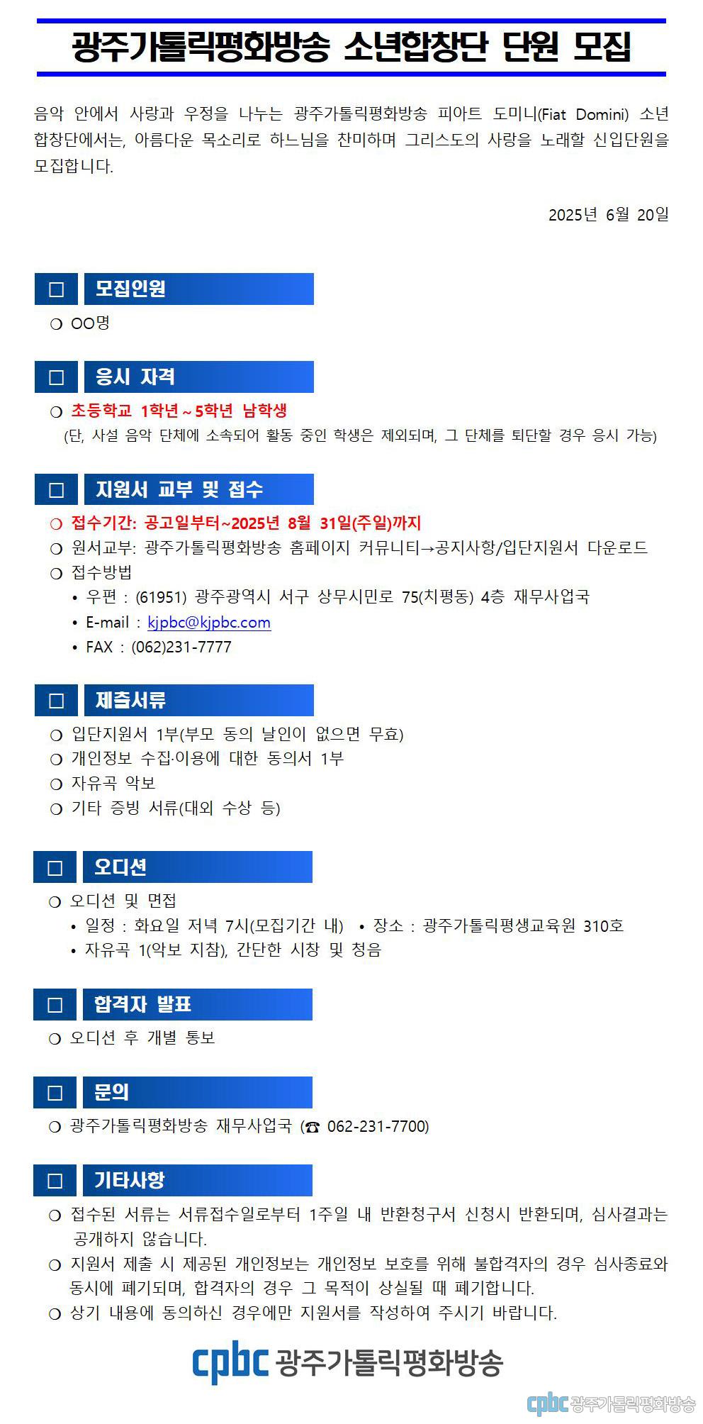 광주가톨릭평화방송 소년합창단 신입단원 모집