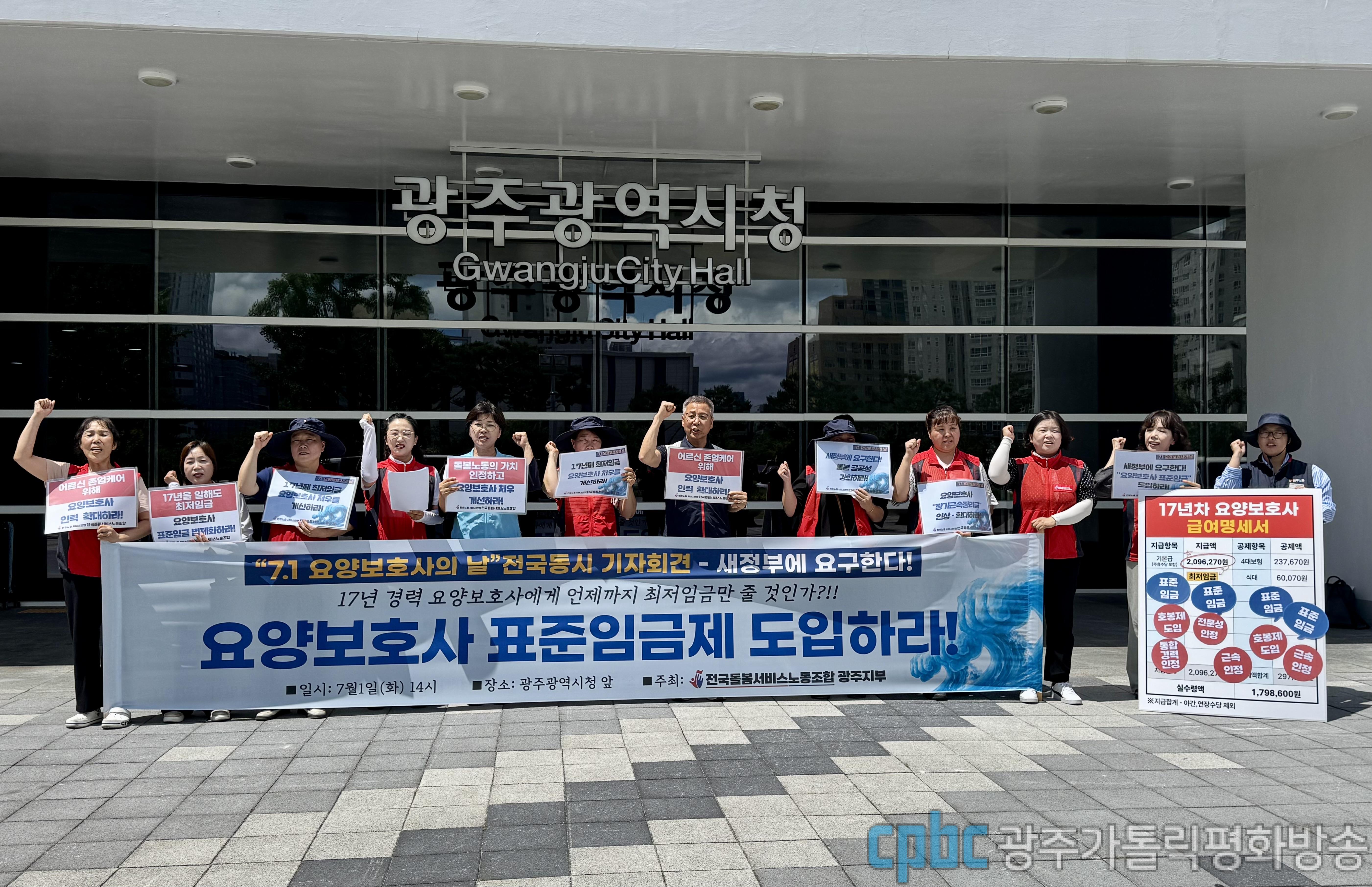 민주노총 서비스연맹 전국돌봄서비스노동조합 광주지부가 1일 광주시청 앞에서 기자회견을 열고 요양보호사 표준임금제 도입을 촉구했다.