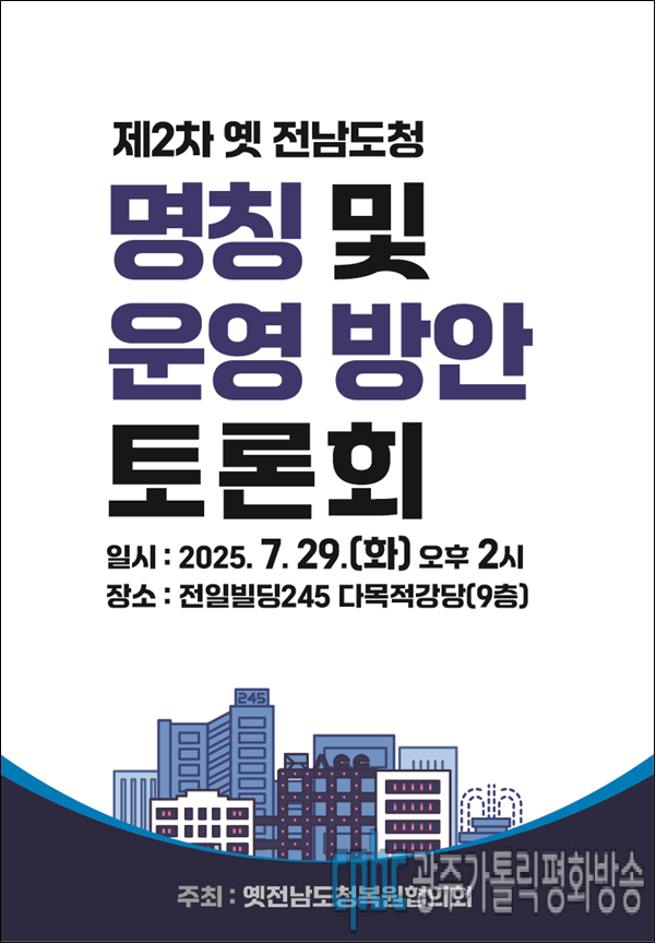 (광주가톨릭평화방송) 김소언 기자 = 옛전남도청복원추진단은 문체부, 광주시, 옛전남도청복원범시도민대책위원회 등으로 구성된 옛전남도청복원협의회(이하 '협의회')와 함께 내일(29일)오후 2시 전일빌딩245에서 ‘제2차 옛 전남도청 복원 건물 명칭 및 운영 방안 토론회’를 개최합니다.