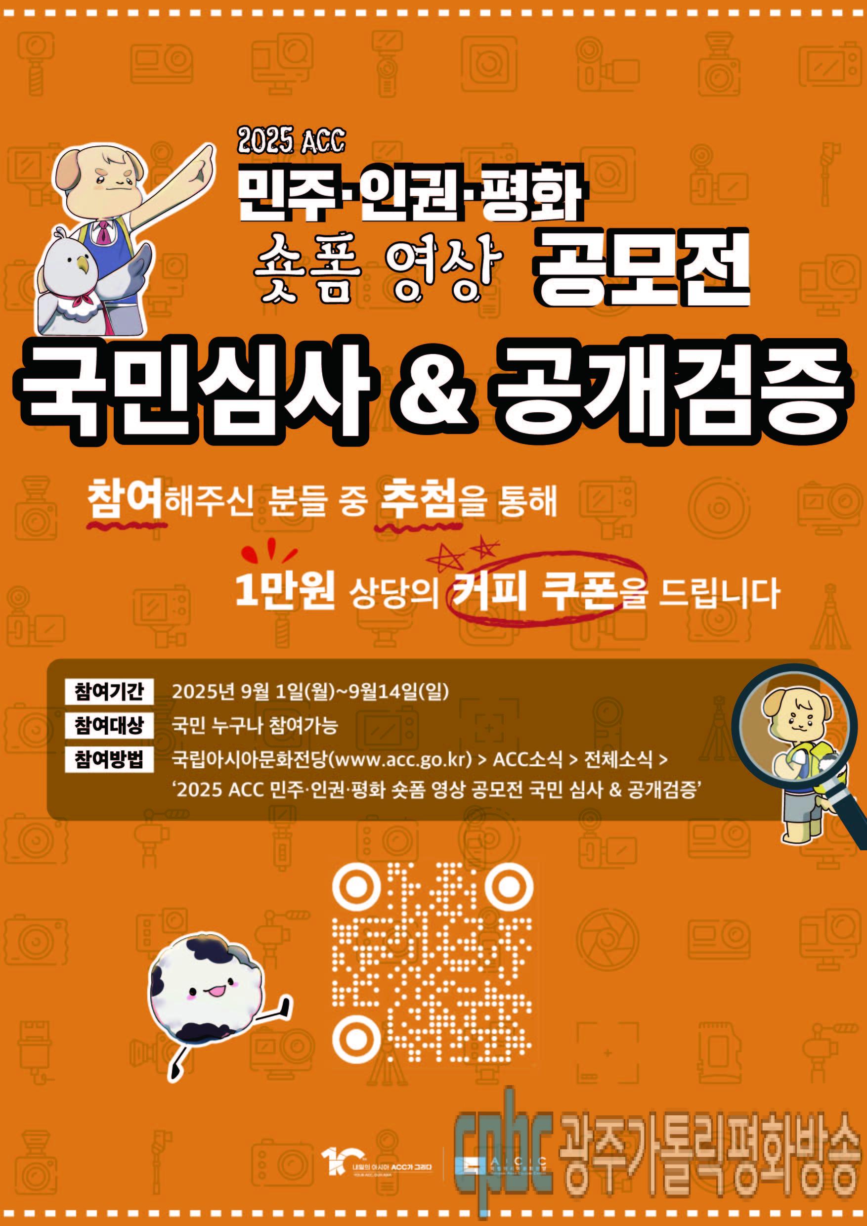 (광주가톨릭평화방송) 김소언 기자 = 국립아시아문화전당(ACC)은 오는 14일까지 2025 ACC 민주·인권·평화 숏폼 영상 공모전 1차 예선 심사를 통과한 작품들을 대상으로 국민심사와 공개검증을 실시합니다.