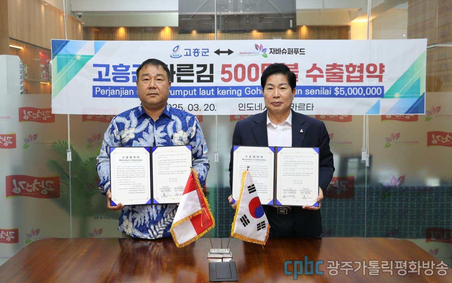 지난 3월 20일 공영민 고흥군수(오른쪽)와 인도네시아 자바슈퍼푸드사 필립배 대표(왼쪽)가 고흥 농수산물 500만 달러 수출협약을 체결했다.<사진제공=고흥군>