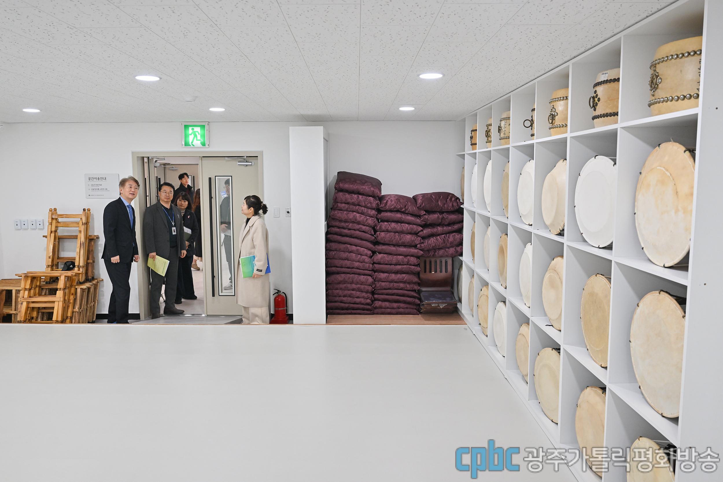 김이강 광주 서구청장이 지난달 25일 리모델링 준공을 앞둔 금호동 빛고을국악전수관에서 공연장, 전수실 등 시설 정비 현황 및 재개관 준비 상황을 점검하고 있다.<사진제공=광주시 서구>