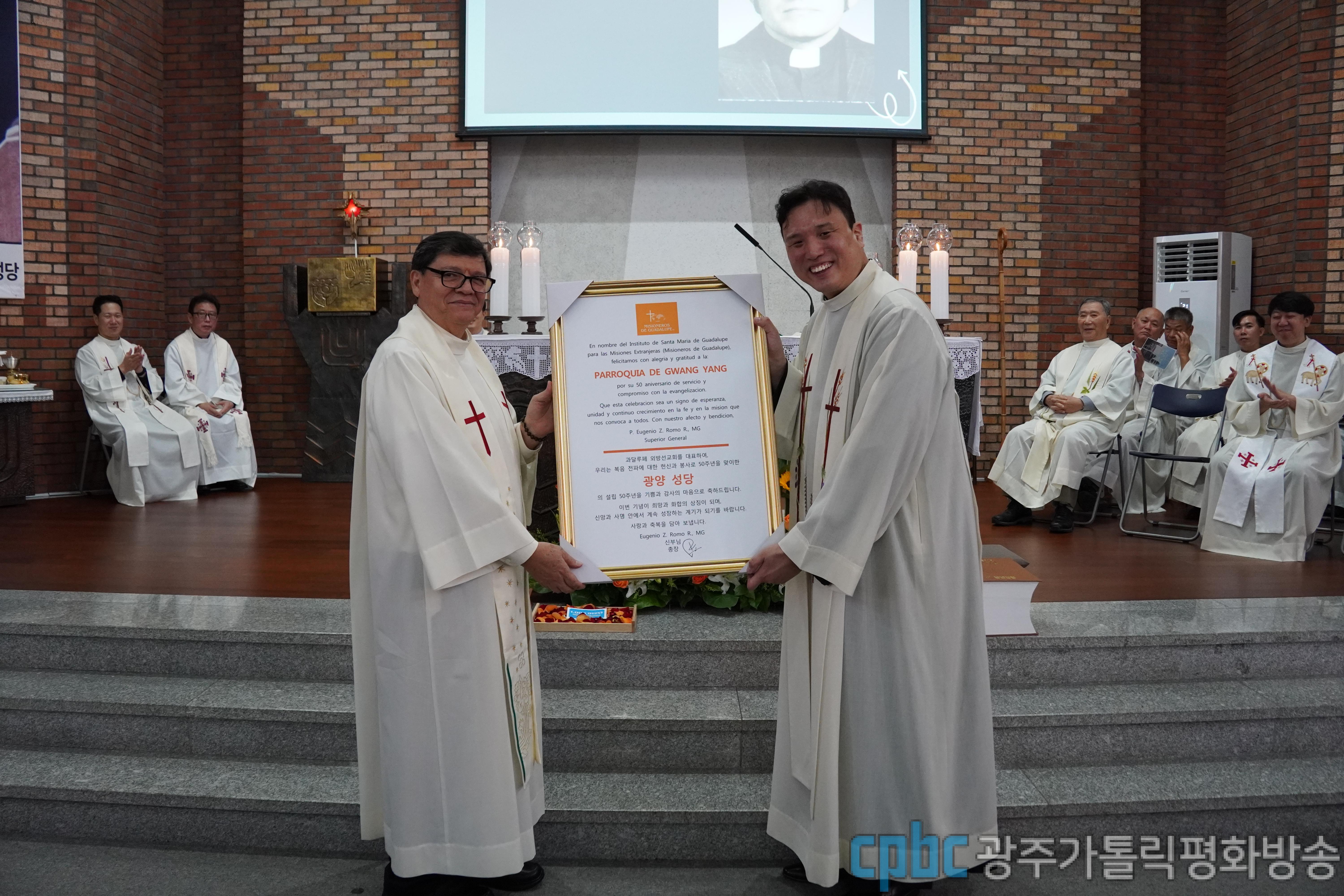 과달루페 외방선교회는 고요한 신부의 50년 전 사목의 시작을 함께 기리며 축하패를 전달했다.<사진제공=광양본당>