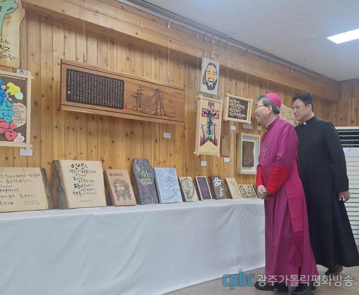 광양본당 설립 50주년을 기념해 지난 25일까지 열린 ‘작은 전시회’를 옥현진 대주교가 성종명 주임신부와 함께 둘러보고 있다.<사진제공=광양본당>