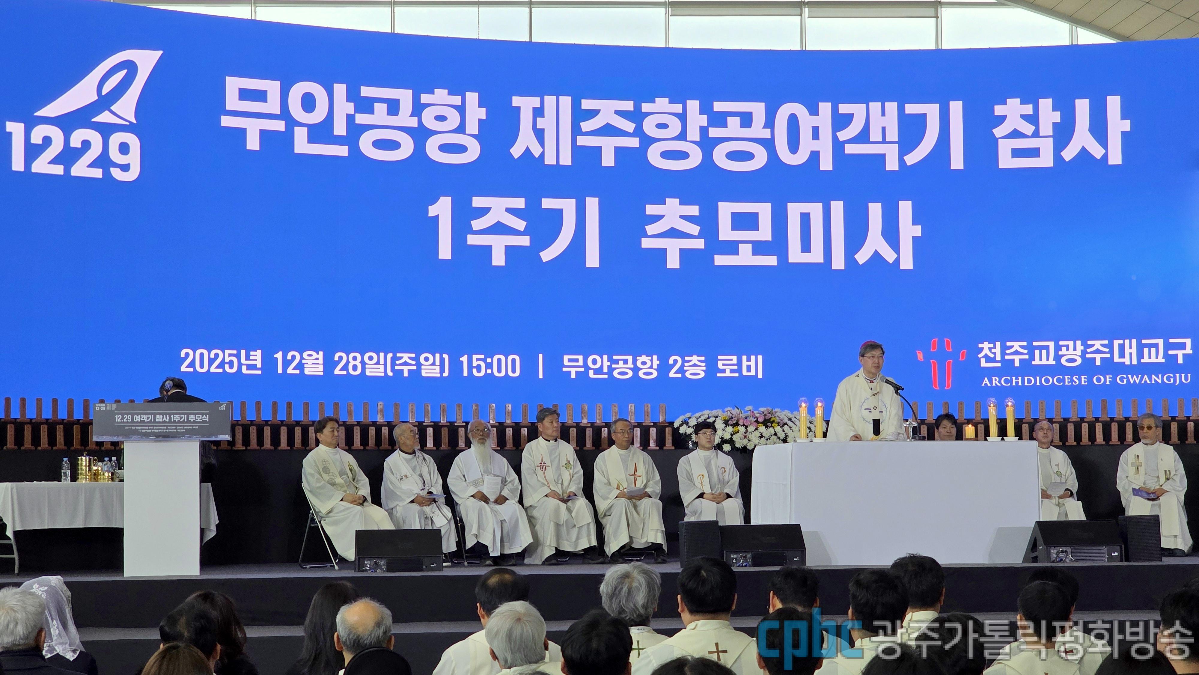 광주대교구는 오늘(28일)오후 3시 무안공항 2층 로비에서 교구장인 옥현진 대주교가 주례한 가운데 봉헌한 '1229 무안공항 제주항공 여객기 참사 1주기 추모미사'에서 이 같이 밝혔습니다.