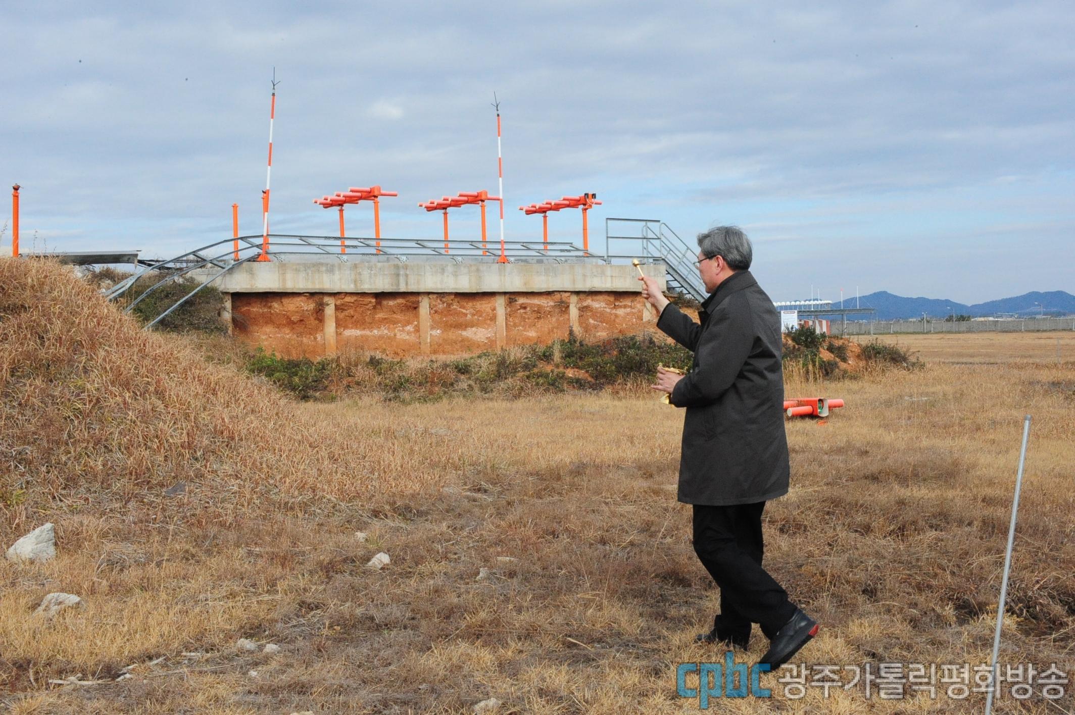 광주대교구장인 옥현진 대주교는 28일 사고 현장인 '로컬라이저(방위각 시설)'를 찾아 성수를 뿌리며 희생자들의 영원한 안식을 기원했다. 옥 대주교 뒤로 철근이 섞인 콘크리트로 만들어진 로컬라이저(방위각 시설)이 보인다.