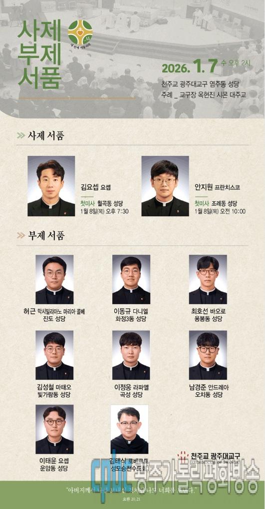 한편, 광주가톨릭평화방송은 오는 7일 오후 2시부터 4시까지 2시간 동안 '2026 사제·부제 서품미사' 실황을 염주동성당을 연결해 라디오와 유튜브를 통해 이원 생중계하며 현장의 생생한 감동을 전달할 예정입니다.